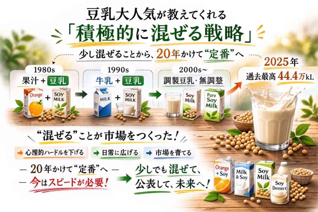1980年代の日本には、100%豆乳を大量消費する市場はありませんでした。混合商品で需要の裾野を広げるあいだに、生産技術が磨かれ、味が洗練され、調製豆乳・無調整豆乳・豆乳スイーツへと市場が育っていきます。 豆乳は、完成された市場があったから広がったのではありません。 “混ぜること”が市場を育てたのです。